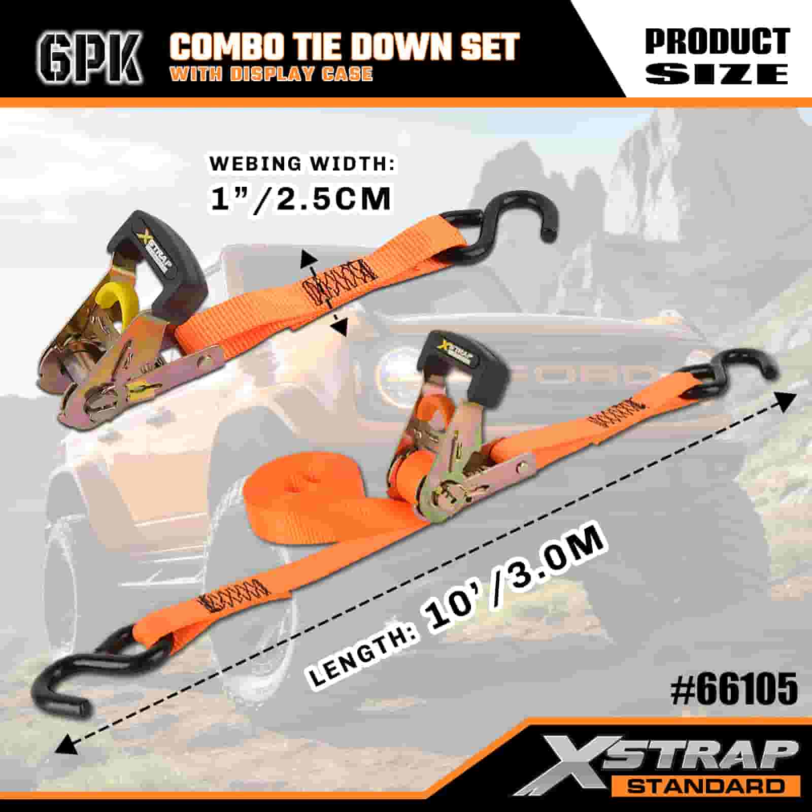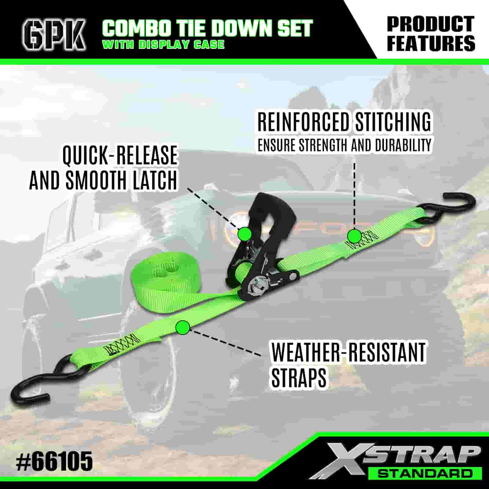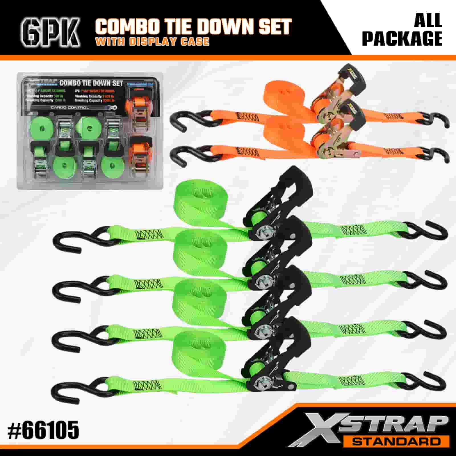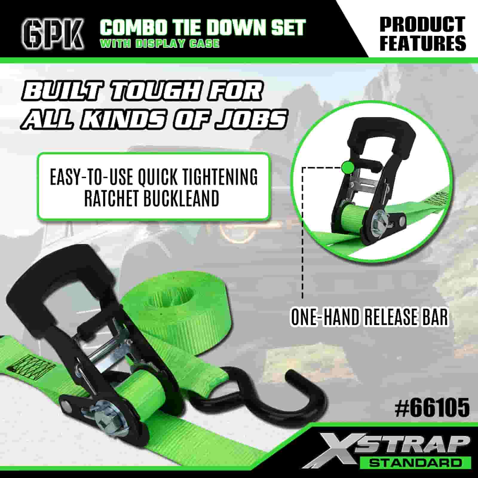 - Georganiseerde combo-displayverpakking: wordt geleverd in een nette, geëtiketteerde vitrine met daarin 4 lichte groene bevestigingsriemen en 2 stevige oranje bevestigingsriemen die de set netjes houden voor opslag, transport en eenvoudige selectie van de juiste riem voor elke taak.
