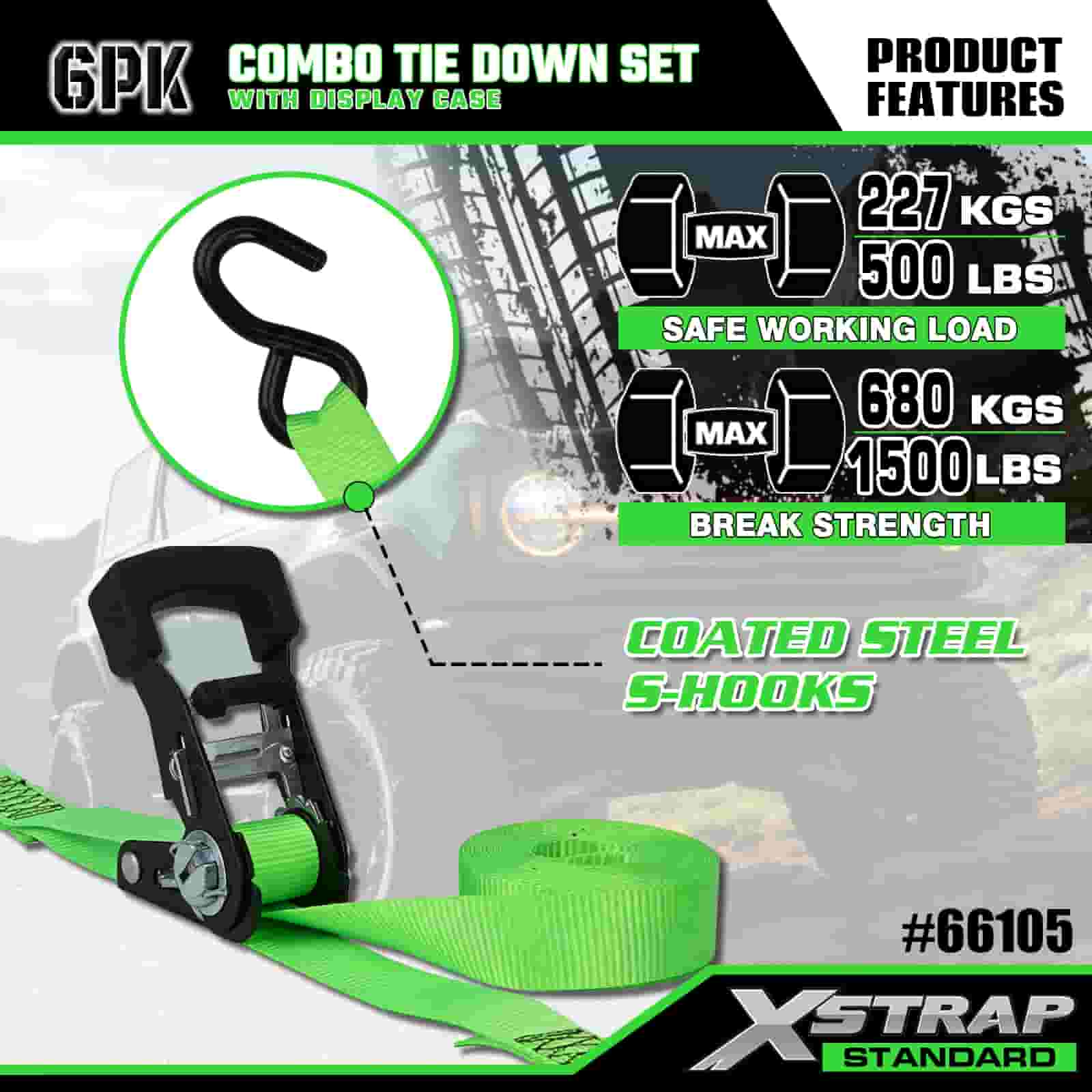 Xstrap 6-pack aluminium spanbanden, 1" x 14' en 1" x 10' polyester spanband Trek-ratelband, capaciteit van 500 lbs en 1100 lbs Ladingspanbanden met S-haken voor vrachtcontrole, pick-up, SUV, auto-bovenrekken, motorfiets.