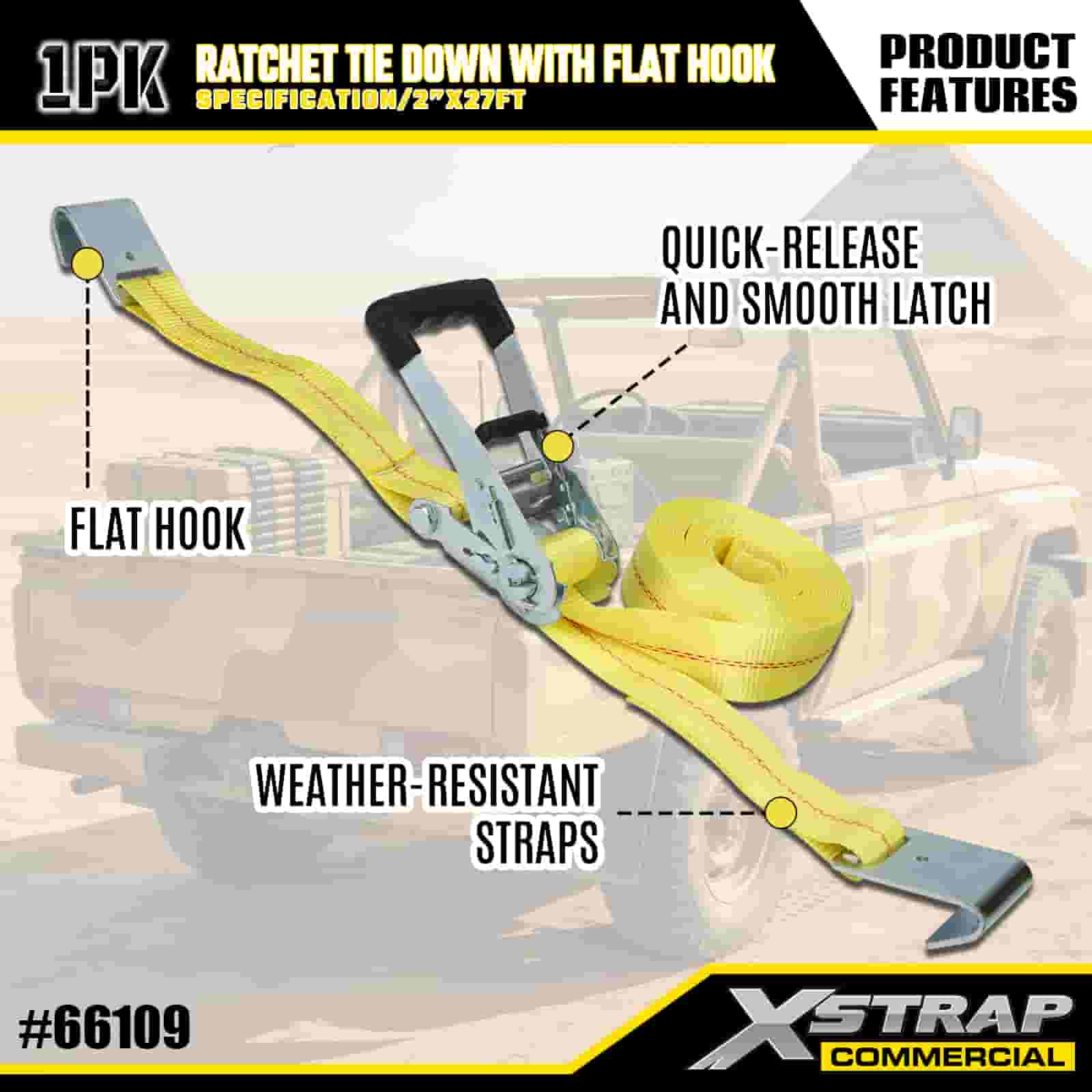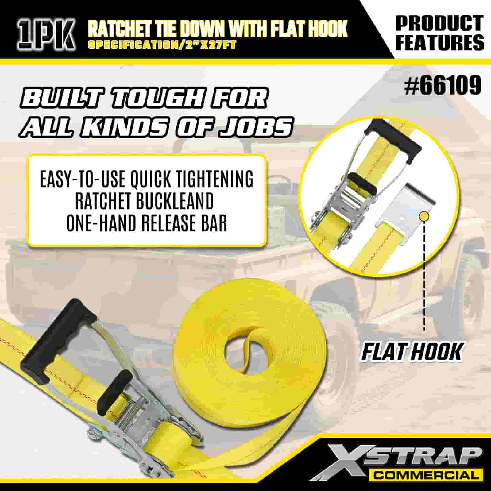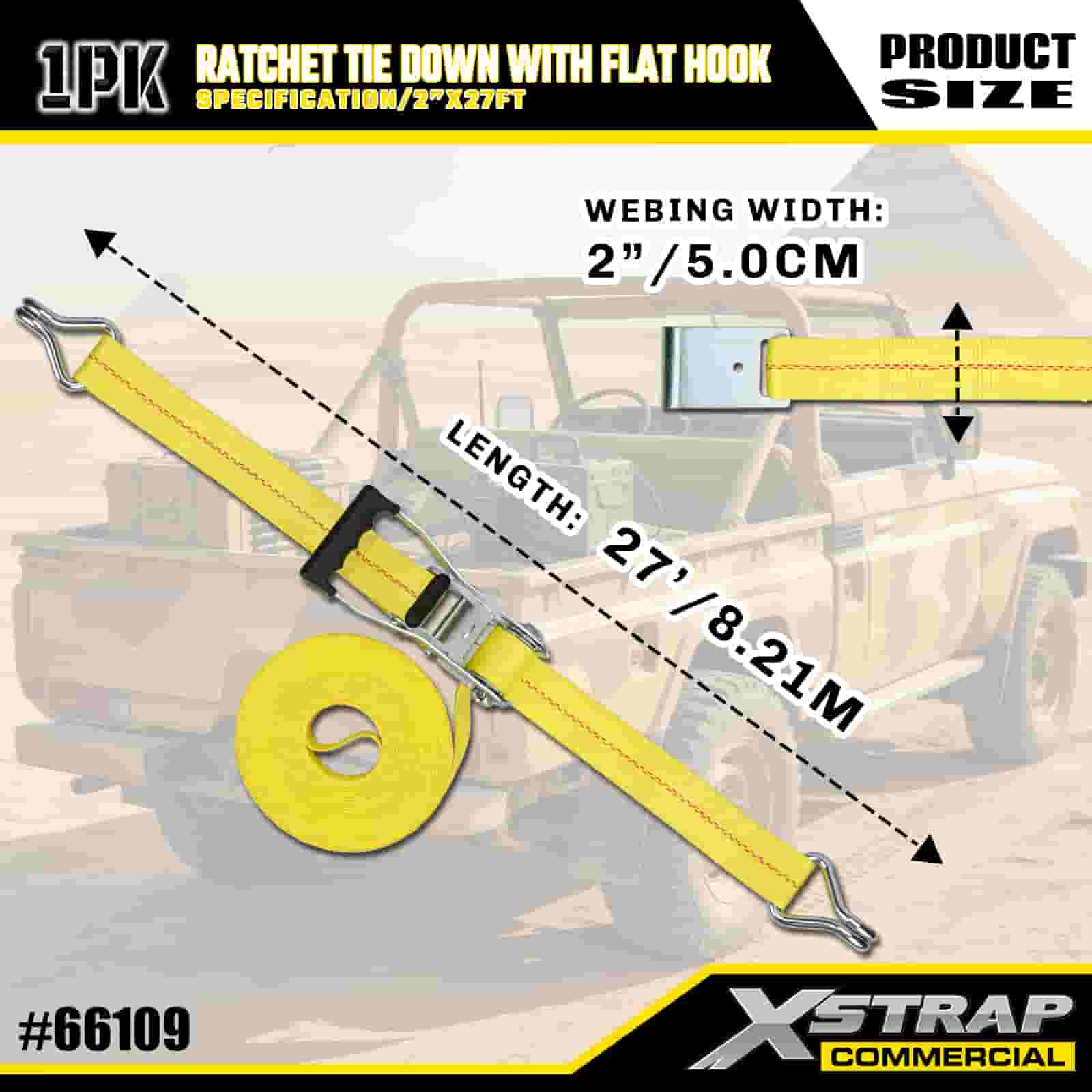 Xstrap Ratelspanband met platte haken, 2" x 27' polyester spanband Trek-ratelband, 3333 lbs capaciteit Ladingspanbanden met platte haken voor vrachtcontrole Pick-up, SUV, auto-bovenrekken motorfiets,.
