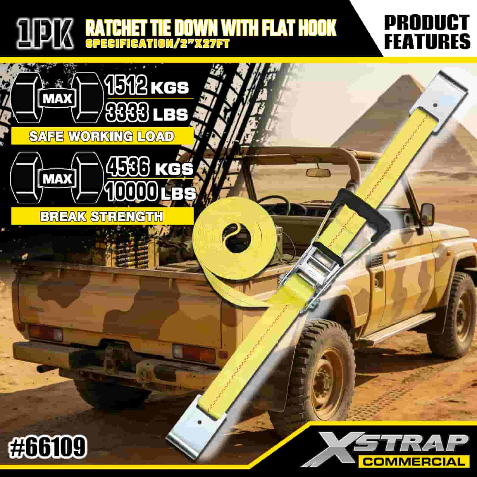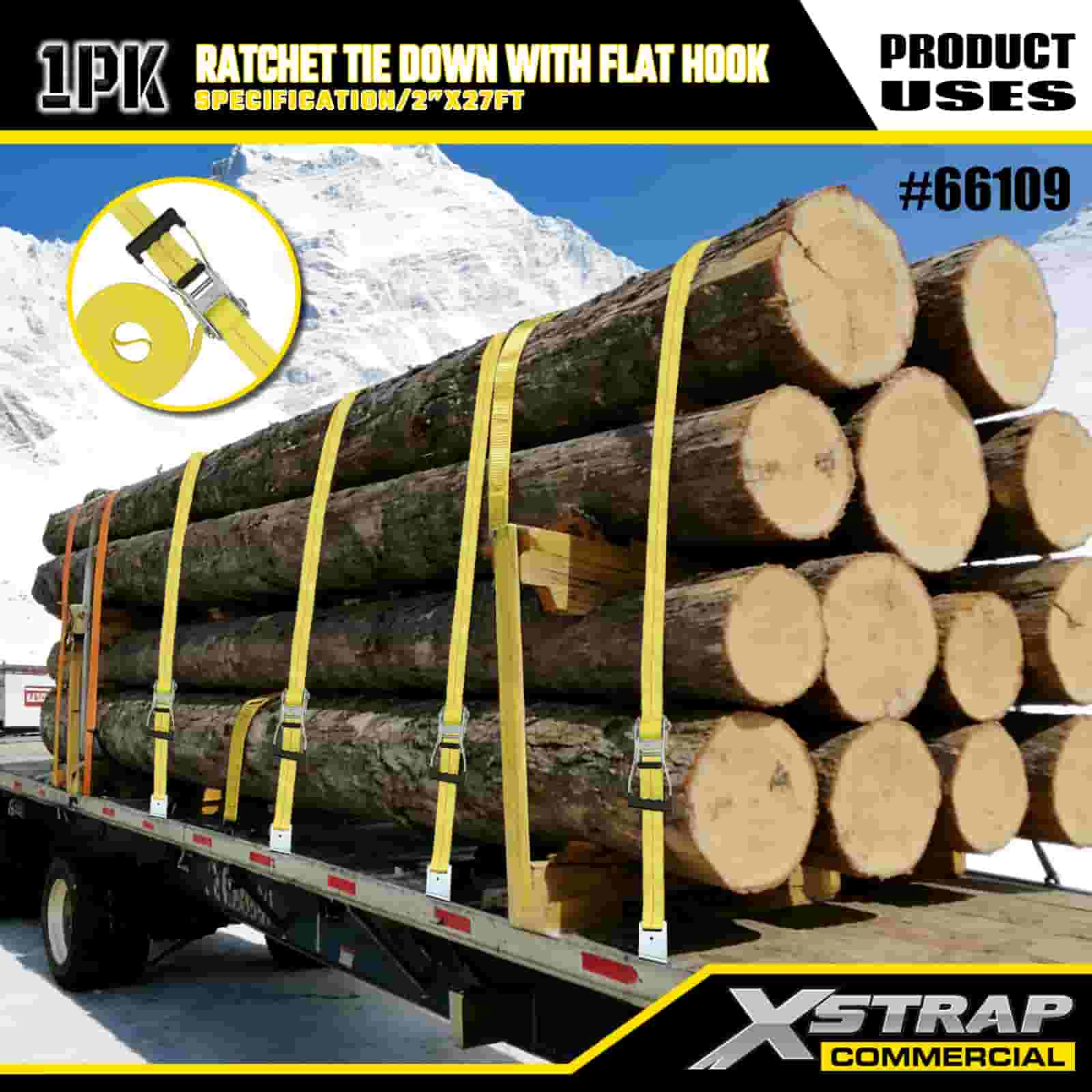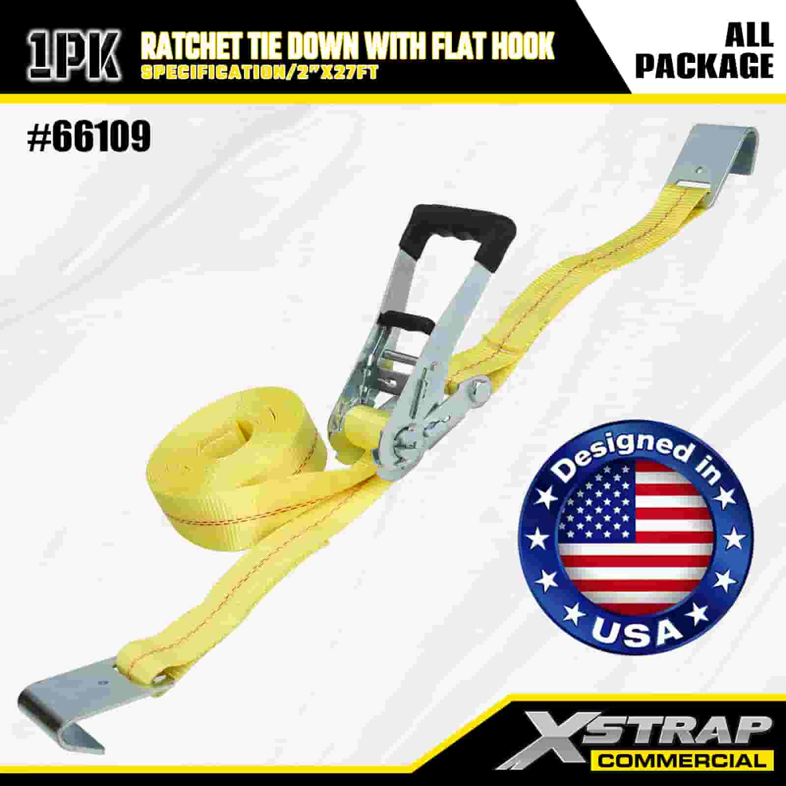 Xstrap Ratelspanband met platte haken, 2" x 27' polyester spanband Trek-ratelband, 3333 lbs capaciteit Ladingspanbanden met platte haken voor vrachtcontrole Pick-up, SUV, auto-bovenrekken motorfiets,.
