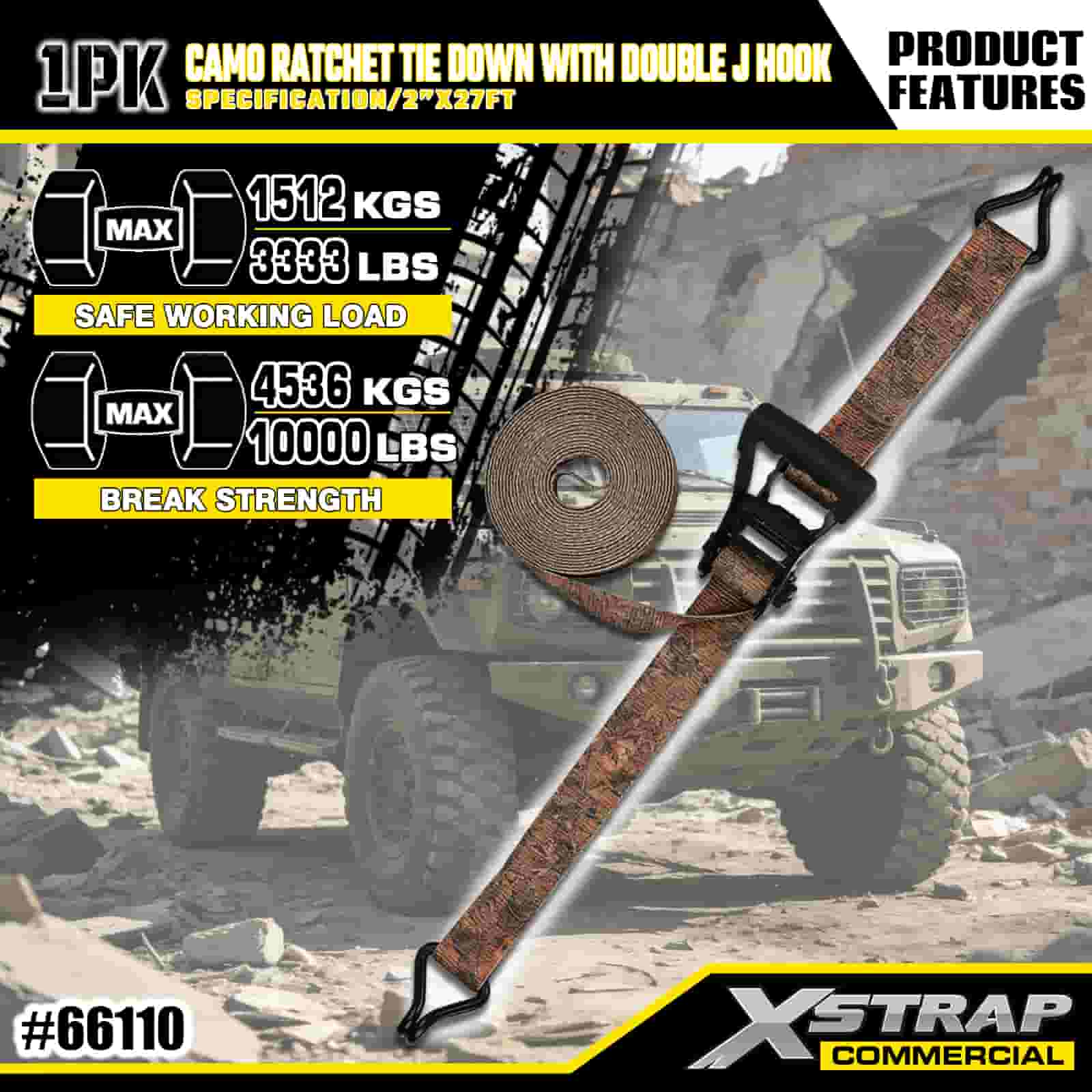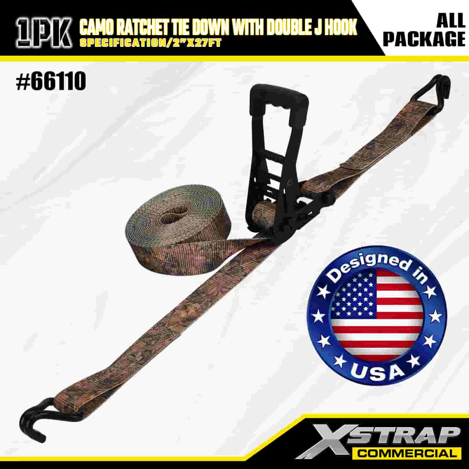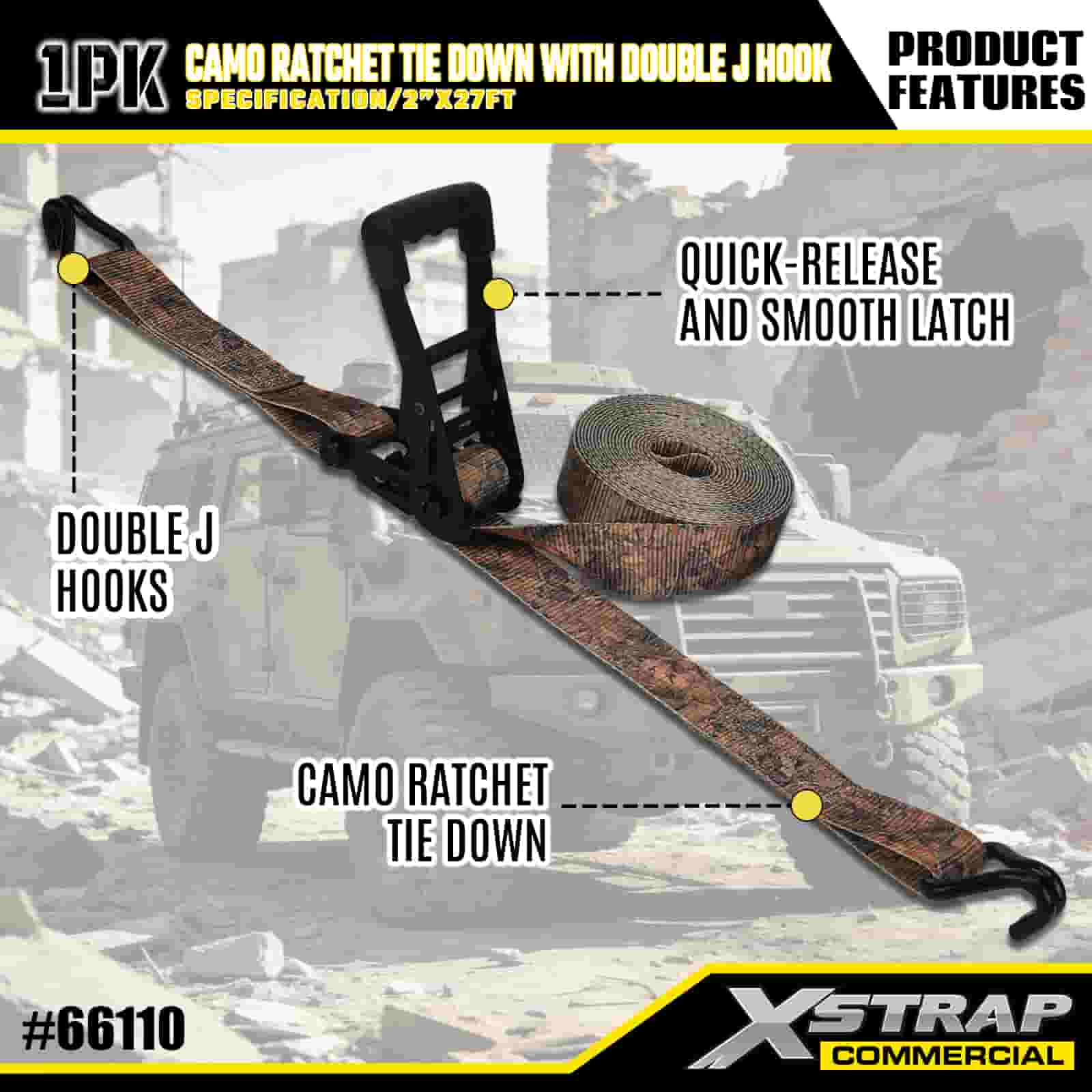 Xstrap CAMO-ratelspanband met dubbele J-haken, 2" x 27' polyester spanband Trek-ratelband, capaciteit van 3333 lbs Ladingspanbanden met dubbele J-haken voor vrachtcontrole, pick-up, SUV, auto-bovenrek, motorfiets.