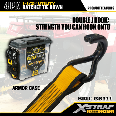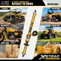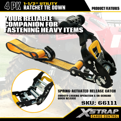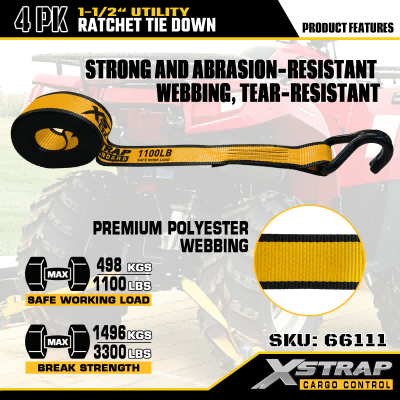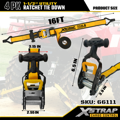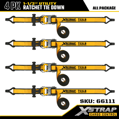 Xstrap 4-pack T-handgreep met spanbanden, 1-1/2" x 16' polyester spanband Trek-ratelband, 1100 lbs capaciteit ladingssjorbanden met dubbele J-haken voor vrachtcontrole, pick-up, SUV, auto-bovenrekken, motorfiets.