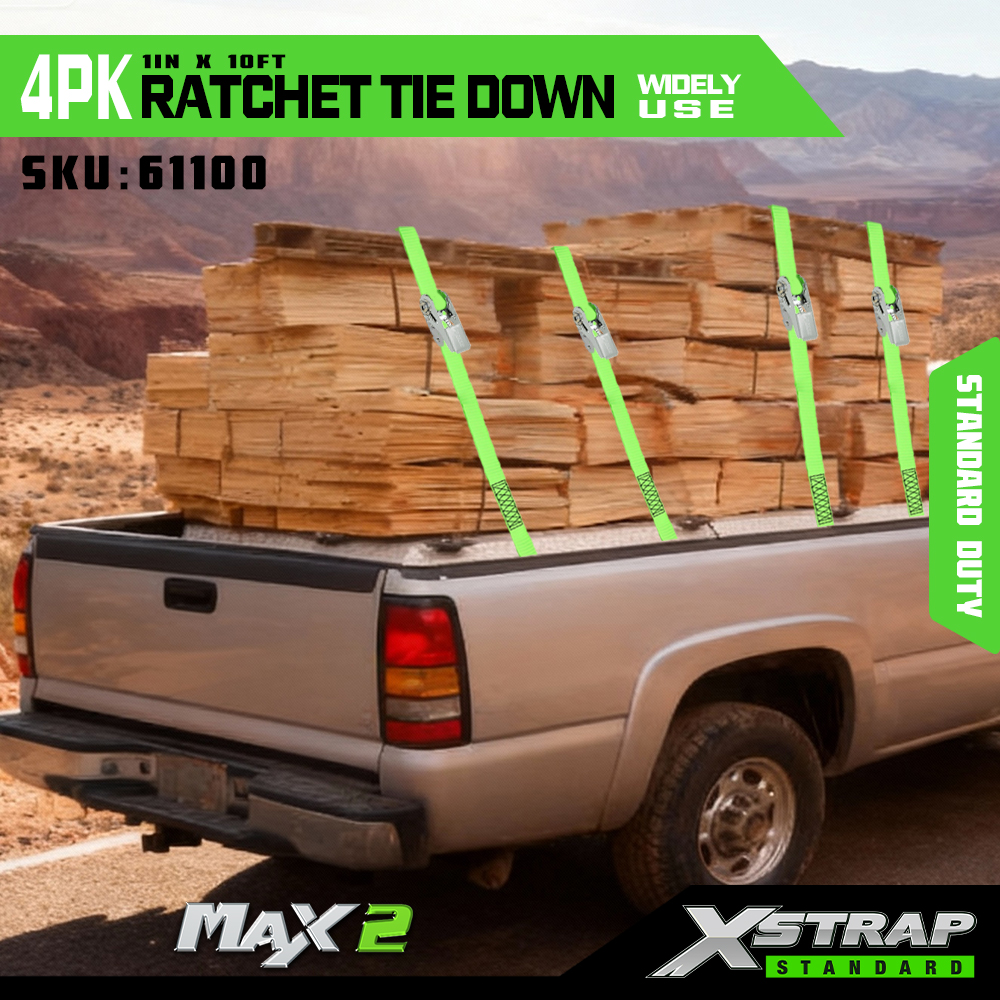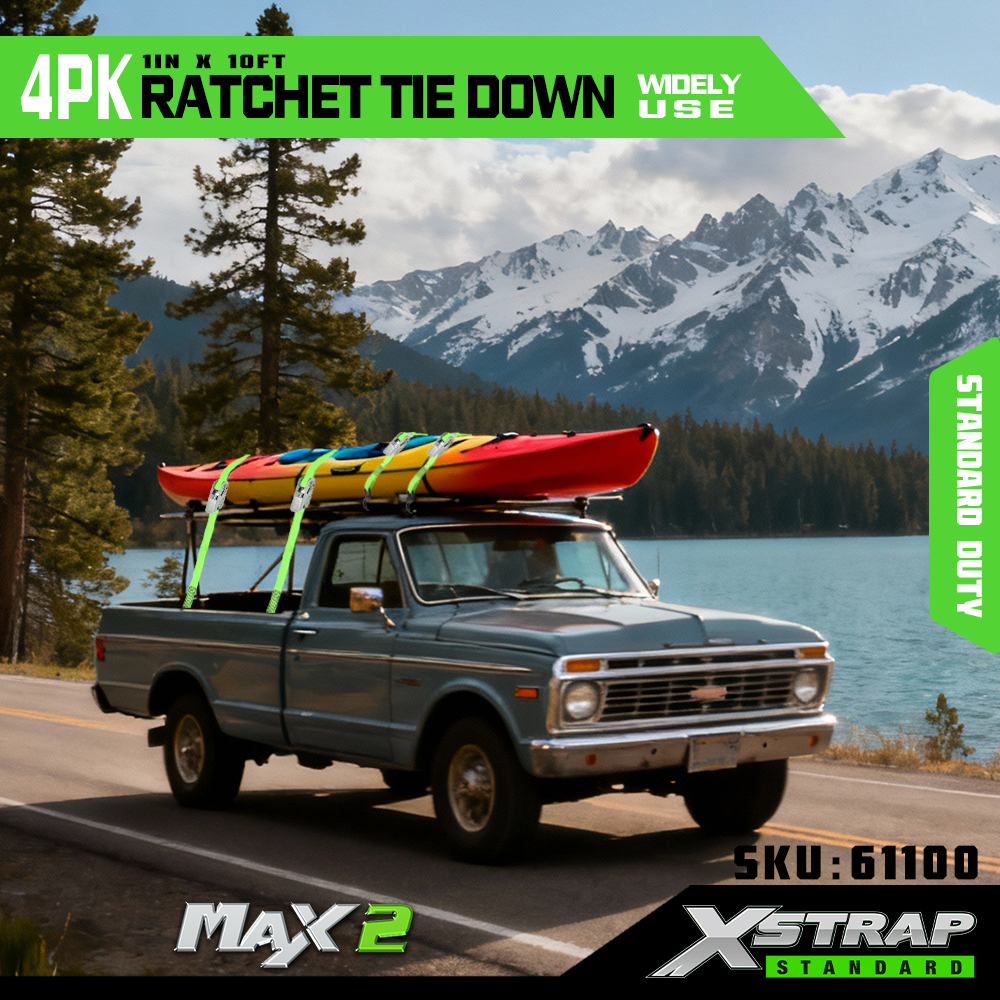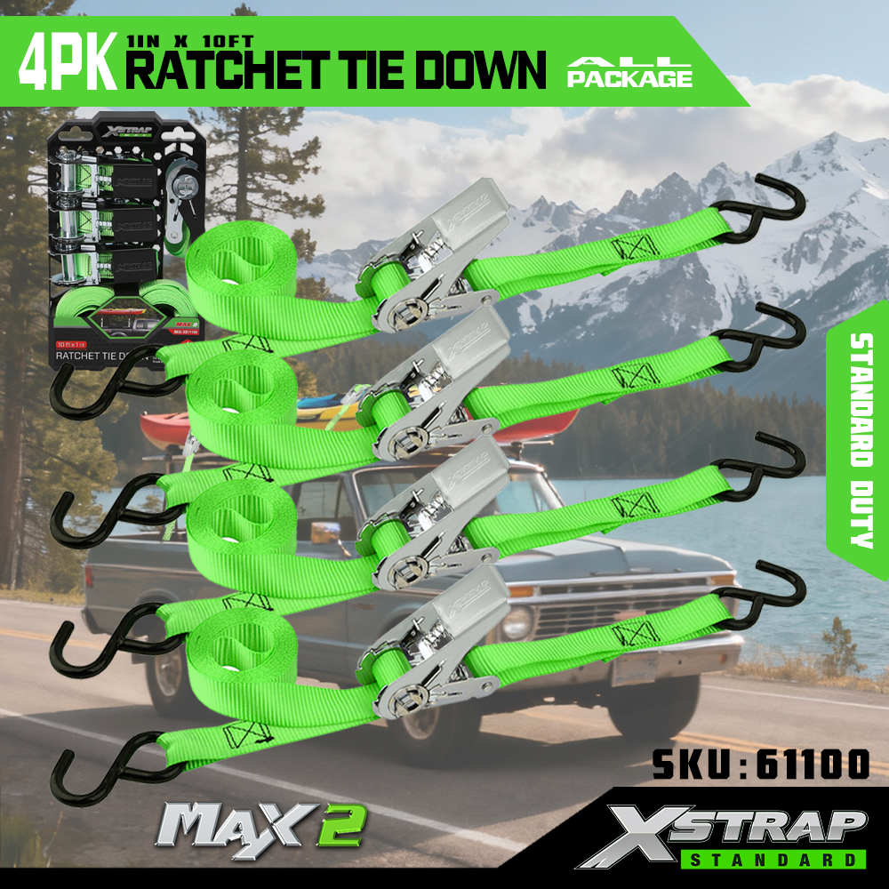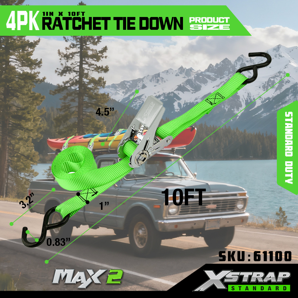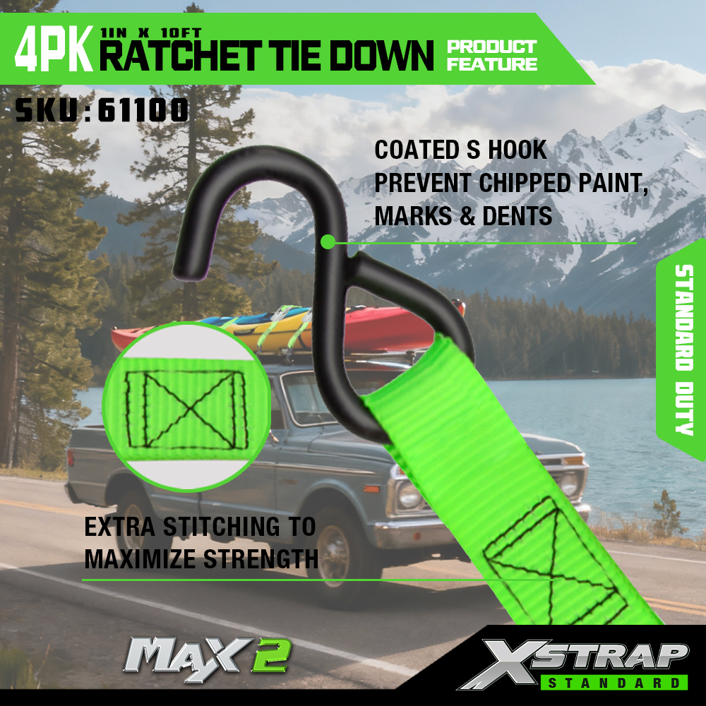 Xstrap 4-pack ratelbinders, 1" x 15' polyester spanband Trek-ratelriem, 500 lbs capaciteit ladingspanbanden met S-haken voor pick-up, lichte aanhangwagenmotorfiets, lichte vissersboot, jetski, sneeuwscooter.