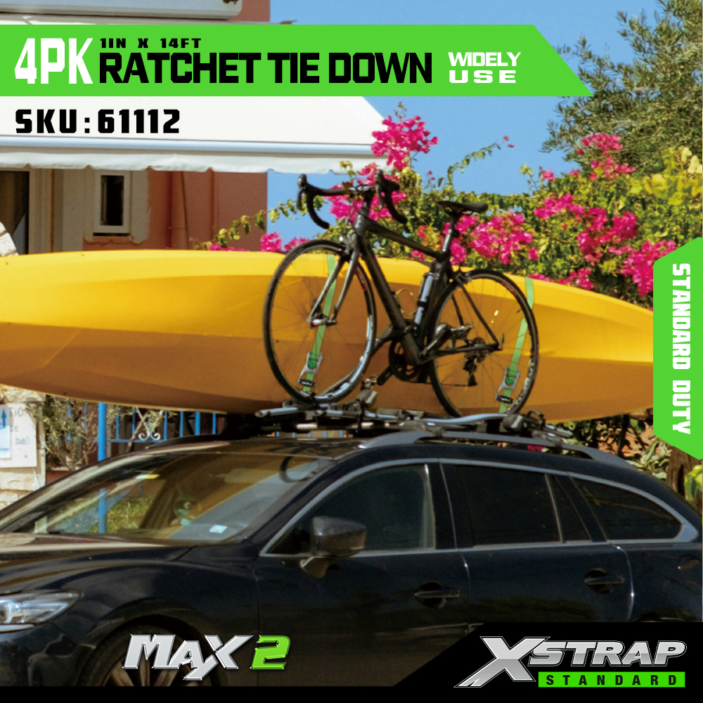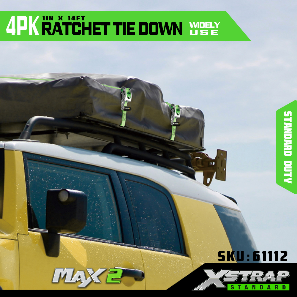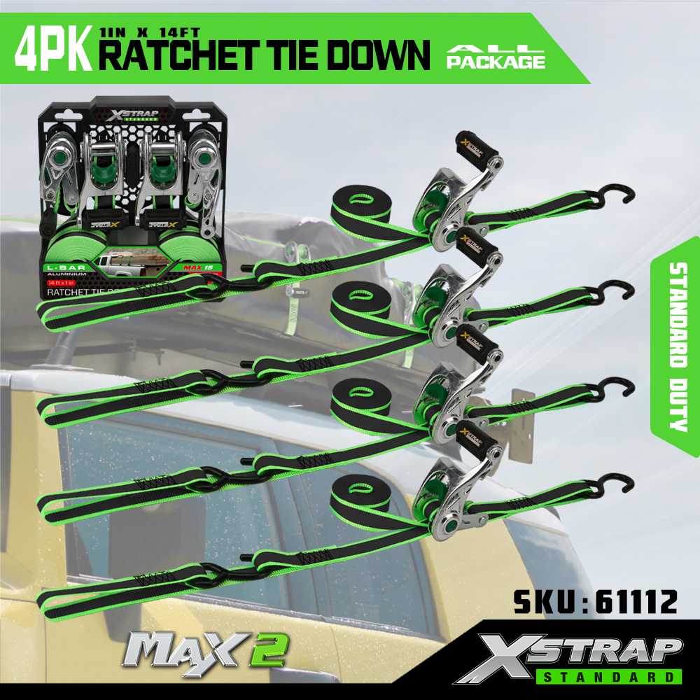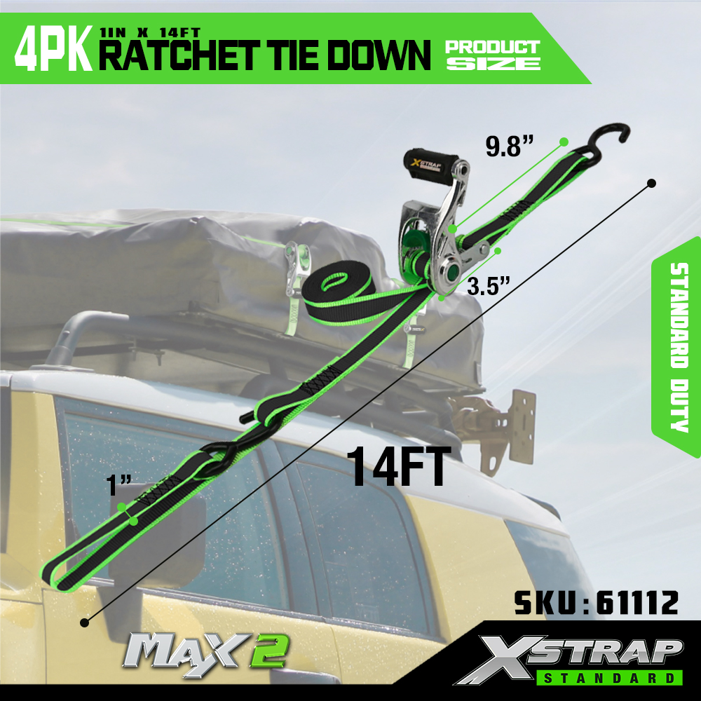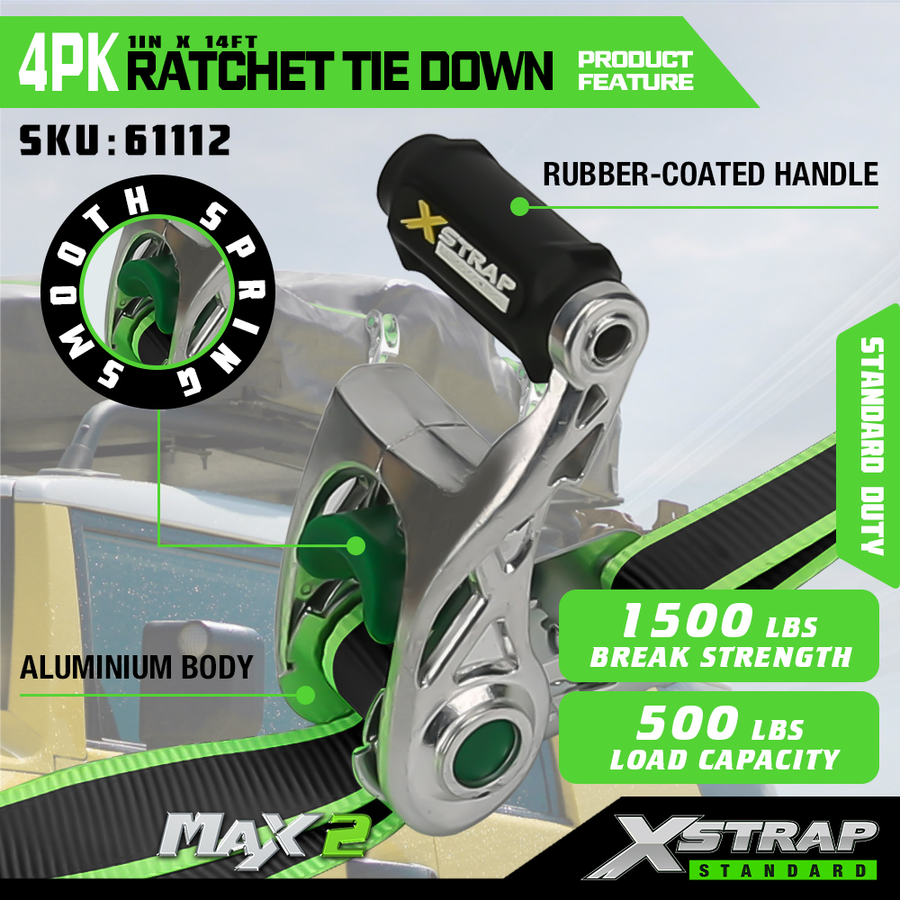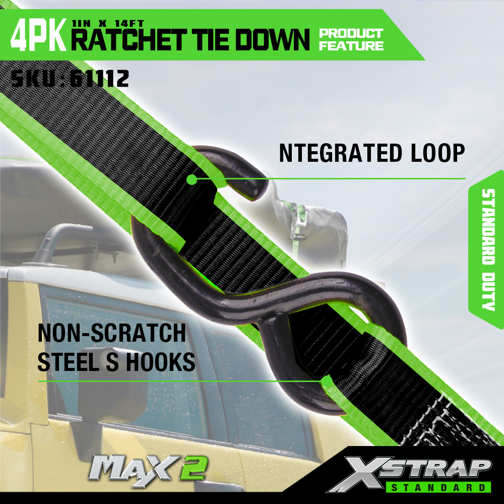 Xstrap 4-pack spanbanden met open handvat, 1" x 14' polyester spanband met zachte lus, capaciteit van 1500 lbs (500 lbs) spanbanden met aluminium ratel en S-haken voor vracht, vrachtwagen, maaier, ATV's