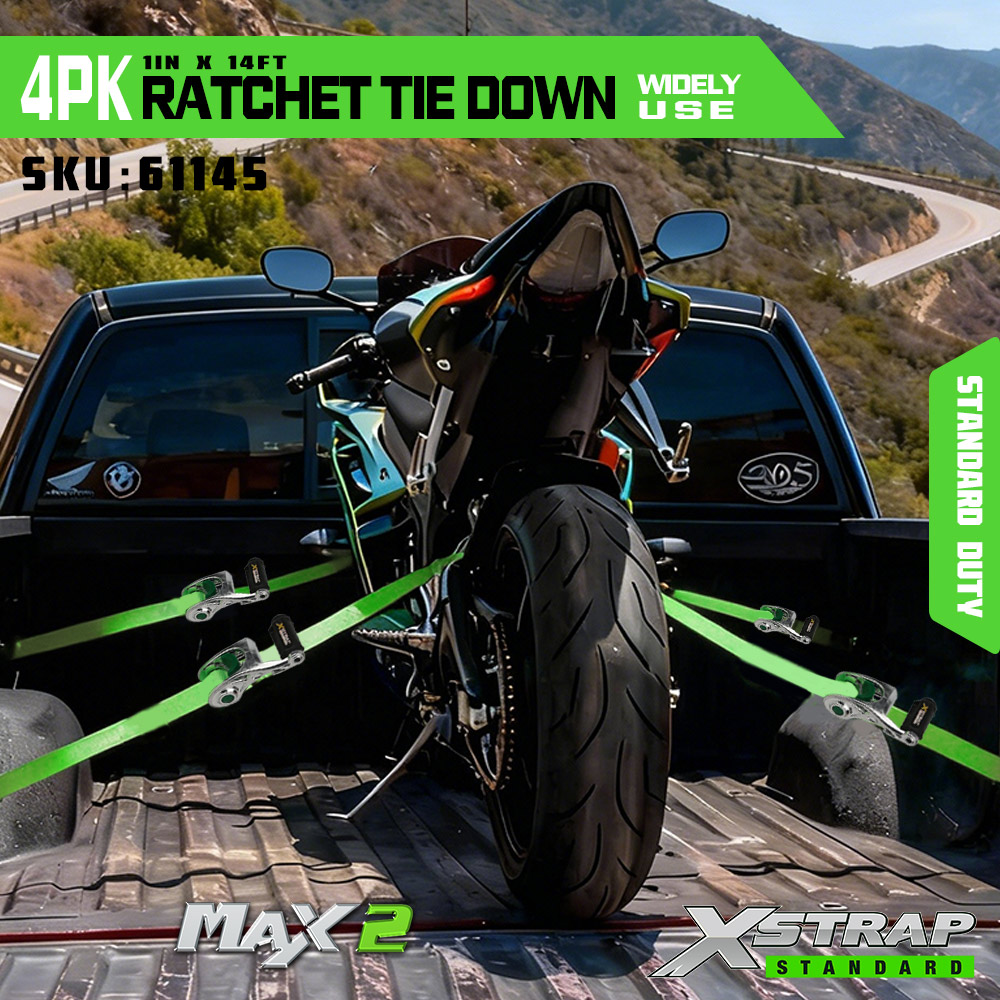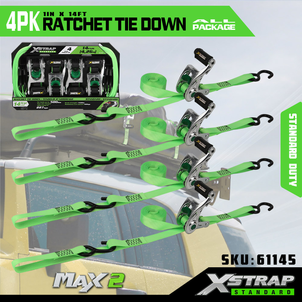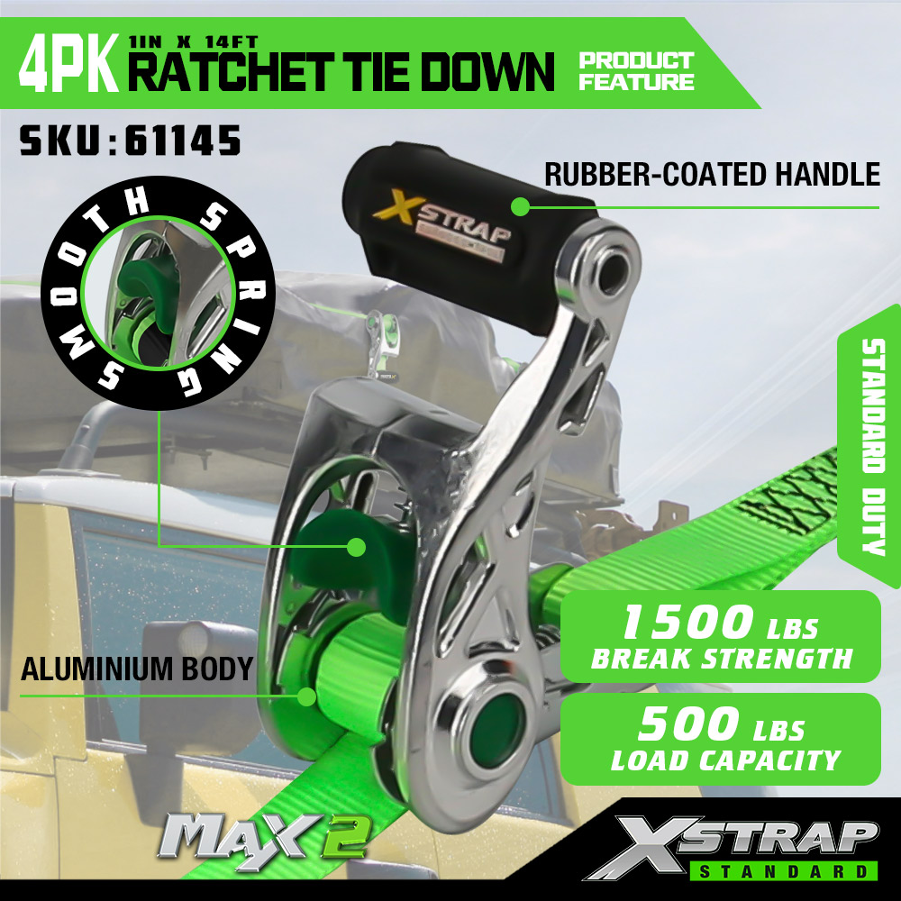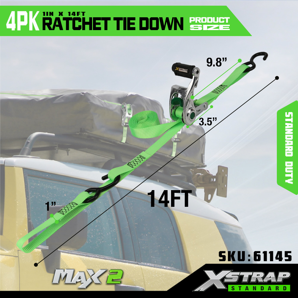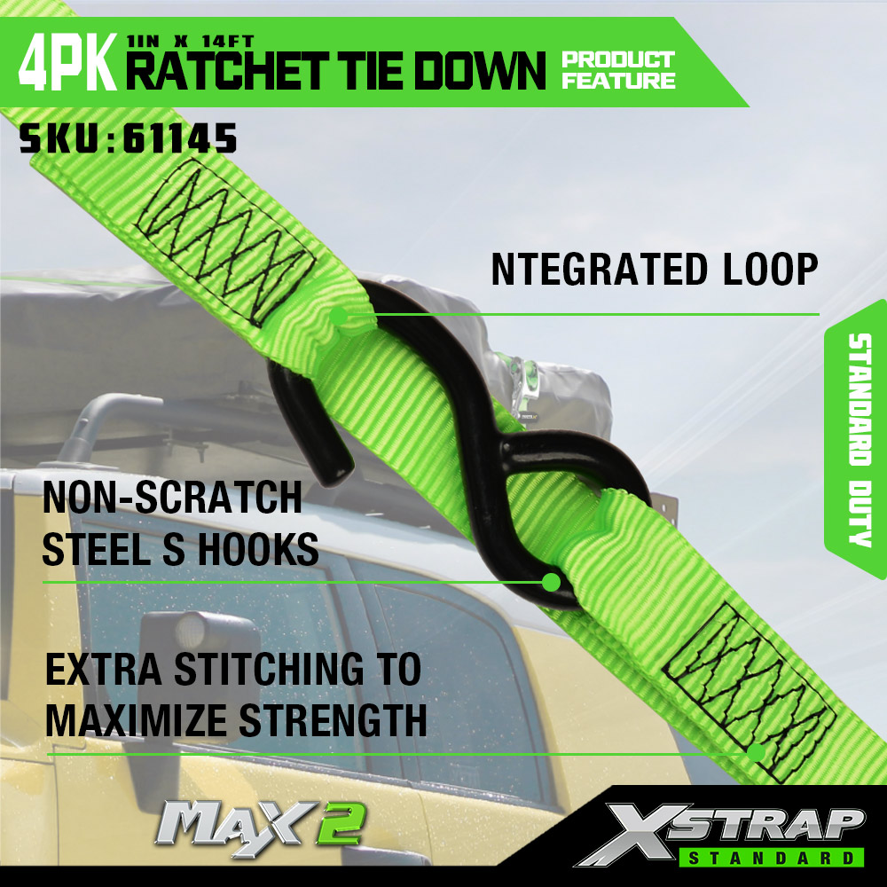 Xstrap 4-pack ratelbinder met zachte lus, 1" x 14' polyester spanband Trek-ratelband, 1000 lbs capaciteit vrachtspanbanden met S-haken voor vrachtwagen, SUV, auto-bovenrekken motorfiets.