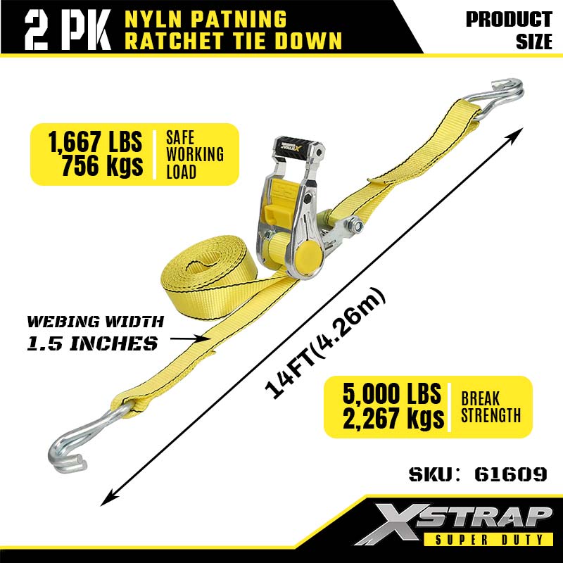 - 2 stuks 14FT maat: 1,5 inch breedte verdeelt de spanning gelijkmatig om schade te voorkomen. 14 voet lengte past op vrachtwagenbedden of dakdragers. Het pakket van 2 biedt voldoende riemen om grote of onregelmatige spullen vast te zetten.