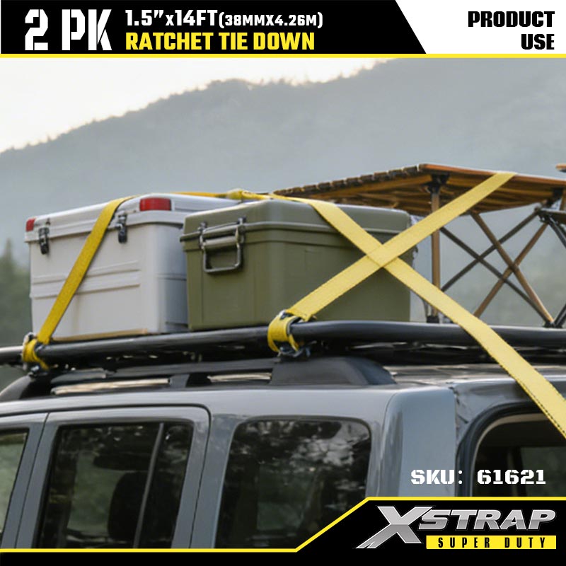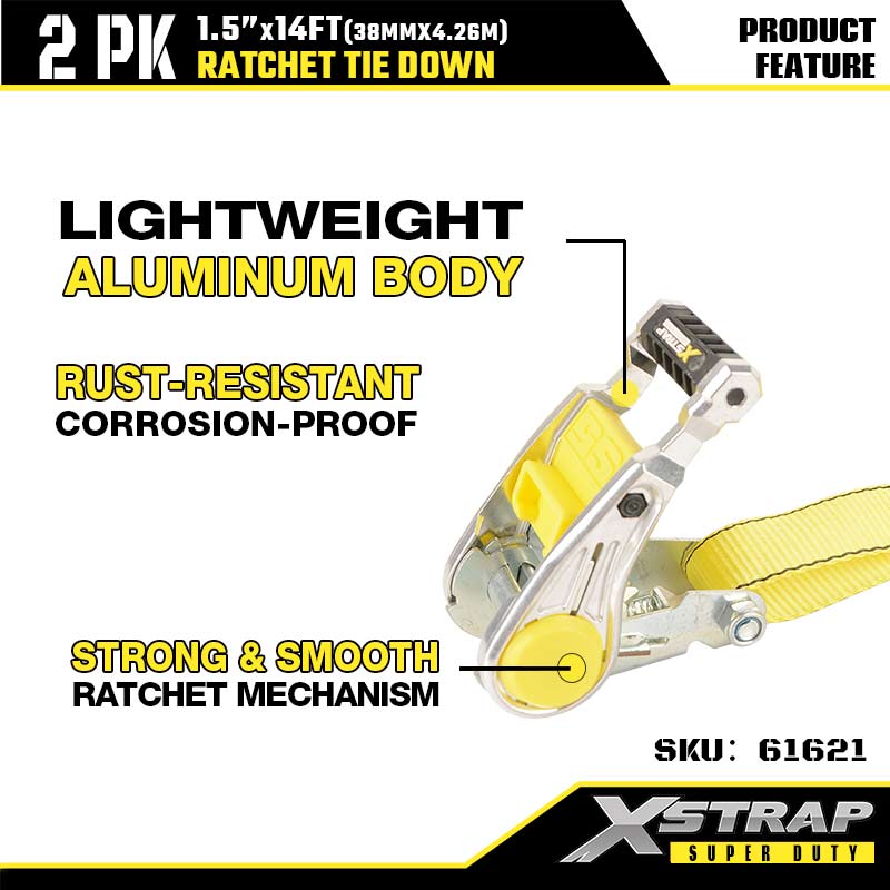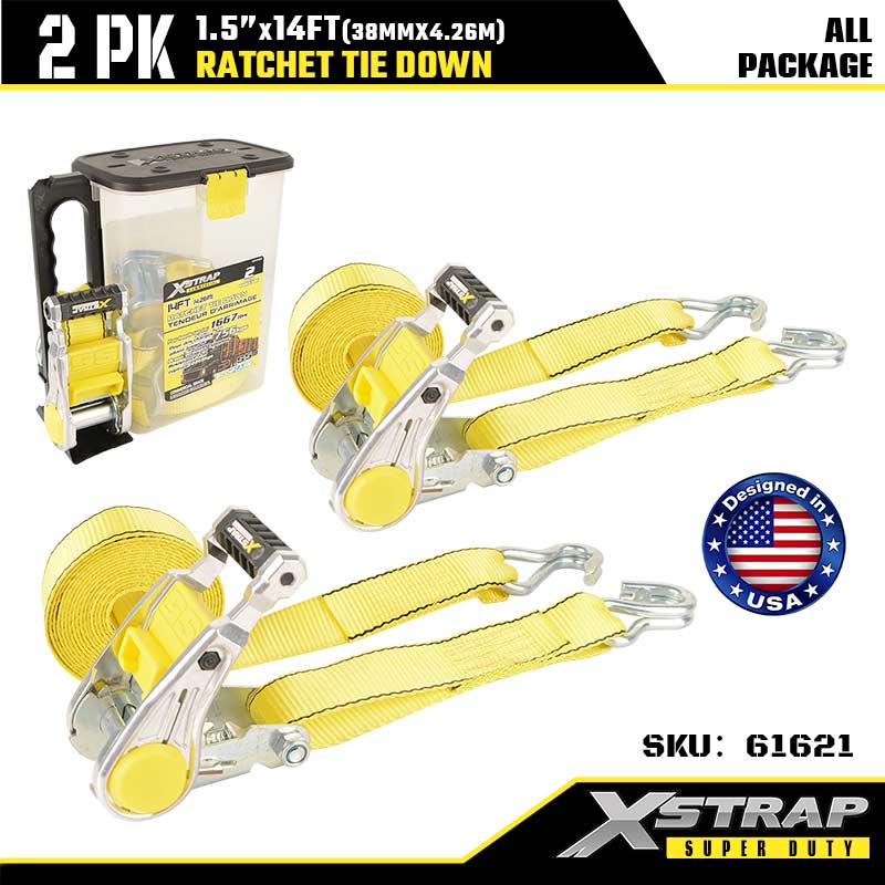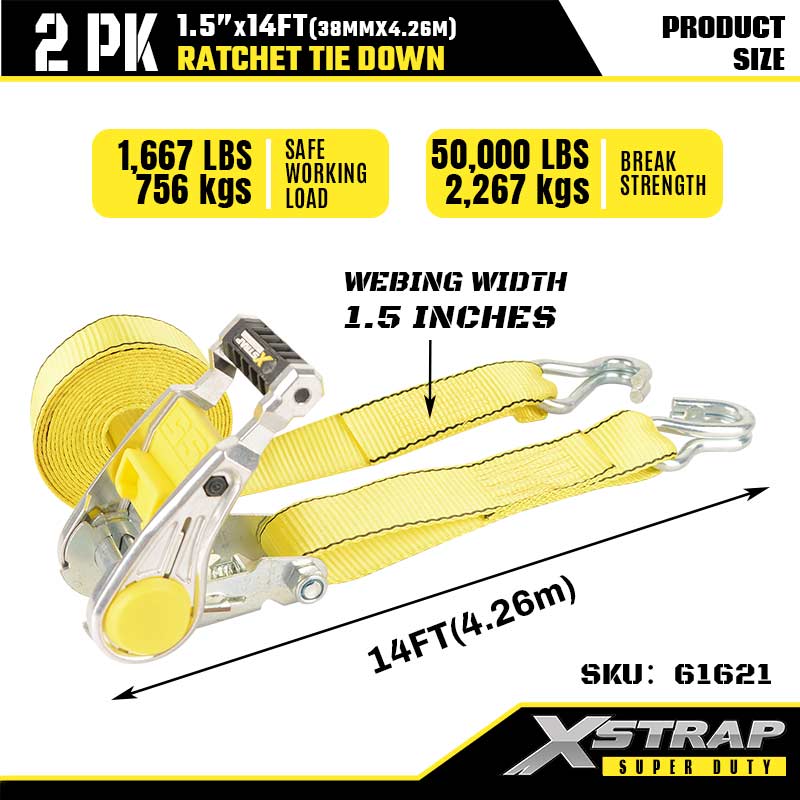 Xstrap 2PK spanbanden met dubbele J-haken, 1-1/2" x 14' polyester spanband Ratelband, capaciteit van 1667 lbs spanbanden met dubbele J-haken voor zware aanhangwagens, aanhangwagens met plat bed, skiboten, kleine auto's, zwaar materieel.