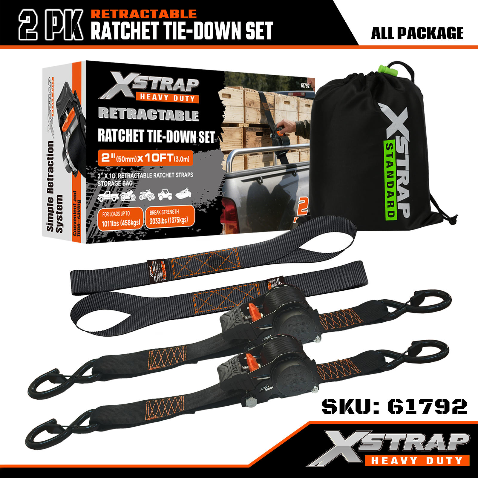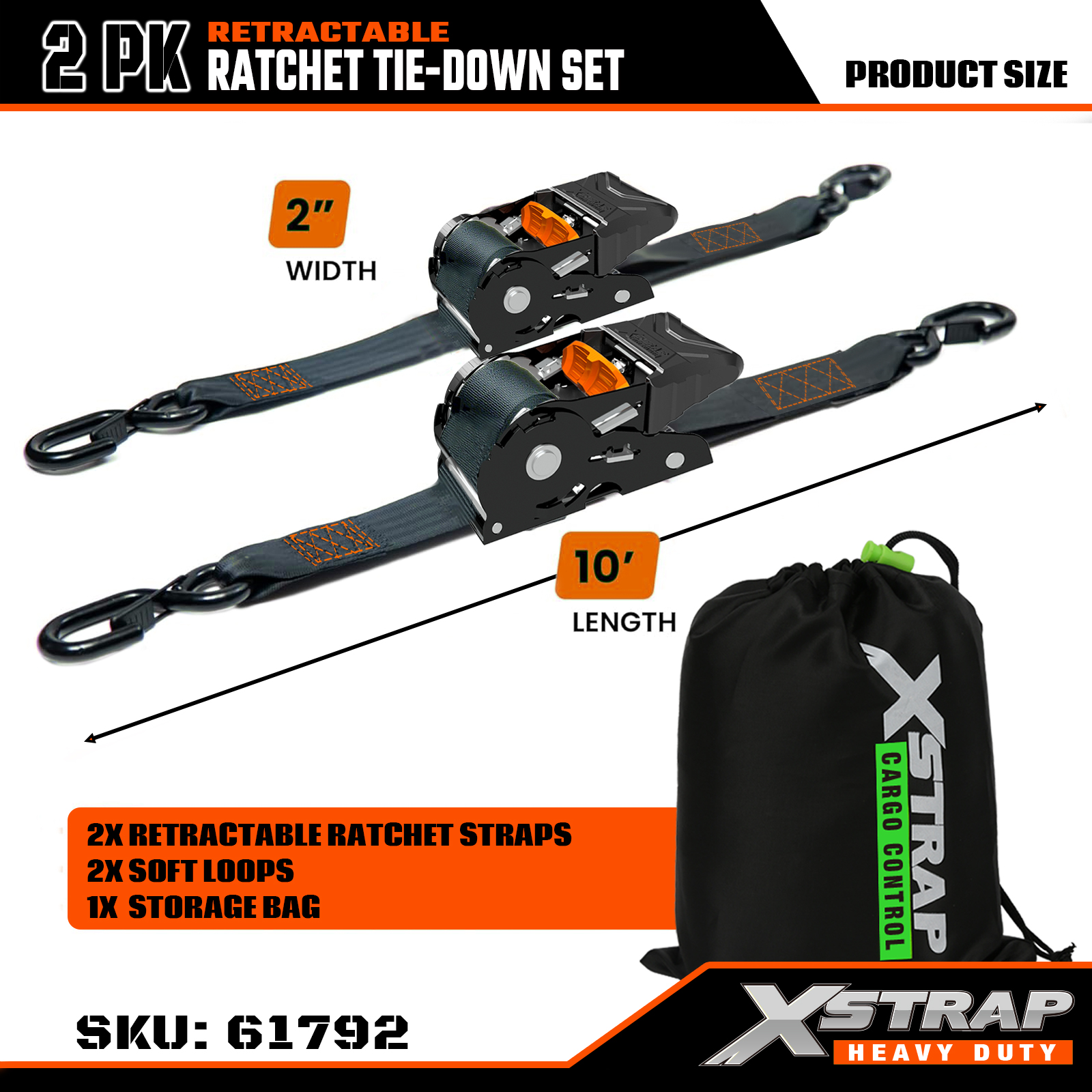 Xstrap 2PK intrekbare ratelspanset met veiligheids-S-haken, 2" x 10' polyester spanband met ratelband, capaciteit van 1011 lbs spanbanden voor het vastzetten van vracht met veiligheids-S-haken voor vrachtwagens, vrachttrailers, motorfietsen.